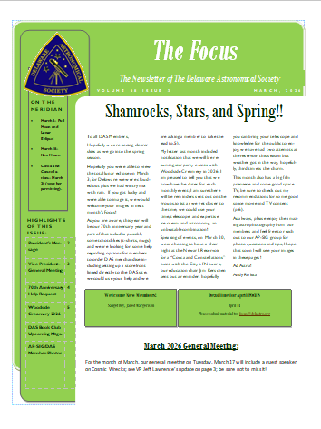 Please click on the image above or click the Download link to view the current Focus in a PDF. If you would like to see a Focus from a previous month or year, you must log-in as a registered Delaware Astronomical Society Member. You can get your login credentials by emailing Rob Lancaster (