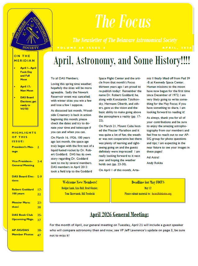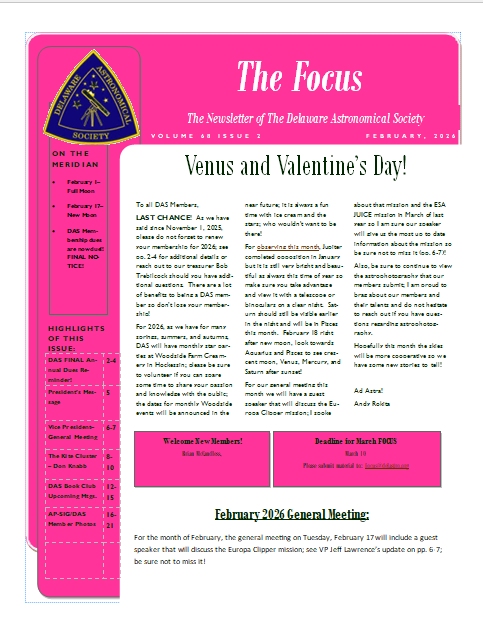 Please click on the image above or click the Download link to view the current Focus in a PDF. If you would like to see a Focus from a previous month or year, you must log-in as a registered Delaware Astronomical Society Member. You can get your login credentials by emailing Rob Lancaster (